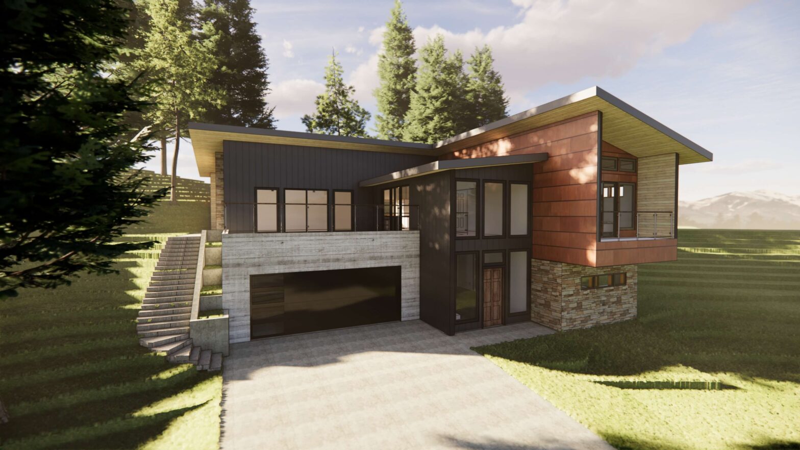 Modular construction with contemporary styling. This design promotes connection to the surrounding landscape and minimizes unwanted solar heat gain with large North facing windows throughout, a roof-deck over the garage, and a solarium framing the view of surrounding mountain range.