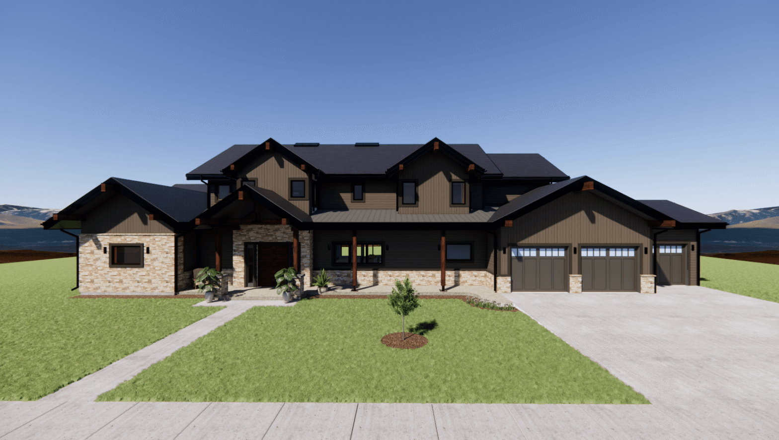 A transitional style home, combining rustic timber elements and steel detailing to define to a cozy home with expansive views to the creek-side property edge and mountains beyond.
